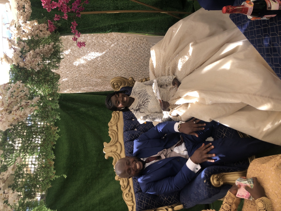 In Kerang, Nigeria, a bald man with a dark complexion, dressed in a blue suit, white shirt, and patterned tie, sits smiling broadly on the left side of a gold and dark blue ornate sofa. A gold watch is visible on his left wrist. To his right, a woman with dark hair and complexion, wearing an embellished, long-sleeved, high-necked cream gown, also smiles while holding a white, handheld fan. The sofa is positioned against a decorated backdrop composed of green artificial grass panels, interspersed with white and pink artificial floral arrangements. A white textured fabric panel is visible behind the woman. On the far left, a partially visible individual holds a stack of currency notes. In the bottom right corner, a dark blue patterned tablecloth covers a surface, displaying a bottle of "Sweet Wine" sparkling beverage. The scene is brightly lit, consistent with an indoor or covered outdoor event.