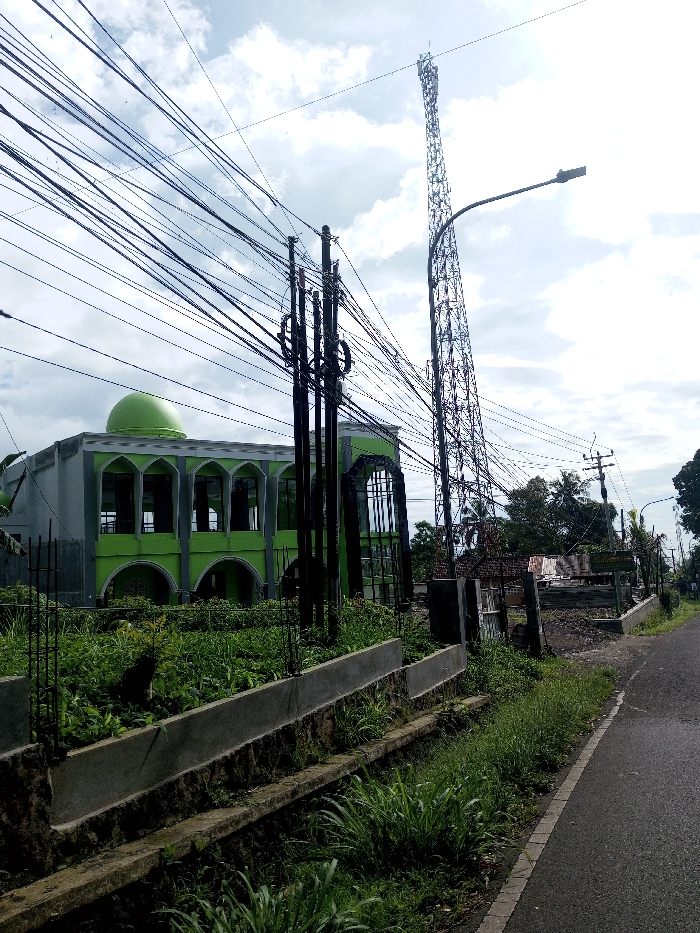The image displays an outdoor, daytime scene under a partially cloudy sky in the city of Domphoog_Dungkarchhoeling, Bhutan. In the left background, a two-story building, resembling a mosque, is visible with a prominent light green dome and light green lower walls featuring multiple arched windows and doorways. The upper section of this structure is grey. In the mid-ground, a cluster of dark utility poles supports numerous tangled black electrical and communication cables that crisscross the upper portion of the frame. To the right of these poles, a tall, dark, metallic lattice communication tower extends upwards, adjacent to a black street lamp that projects over a paved asphalt road. The foreground features a two-tiered concrete retaining wall or planter box filled with dense green foliage and overgrown vegetation. Grass and weeds are also present along the edge of the asphalt road on the far right. Trees are discernible in the background on the right side. No individuals are present in the scene.