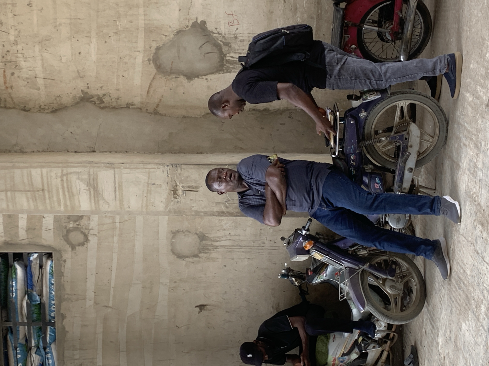 Three men are standing near motorcycles in an indoor space in Fagge C, Nigeria. The area has concrete walls. The man closest to the foreground is wearing a black shirt and baseball cap and is near bags of goods. The second man is wearing a grey shirt and jeans, and has his arms crossed. The third man is wearing a black t-shirt and light jeans, has a black backpack and is touching the handlebars of a motorcycle.