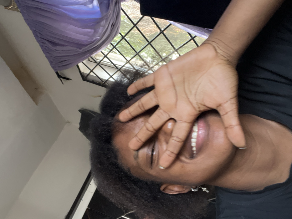 A person with dark skin and voluminous dark hair is depicted indoors in Lokoja, Nigeria, smiling broadly while obscuring the upper portion of their face with their right hand