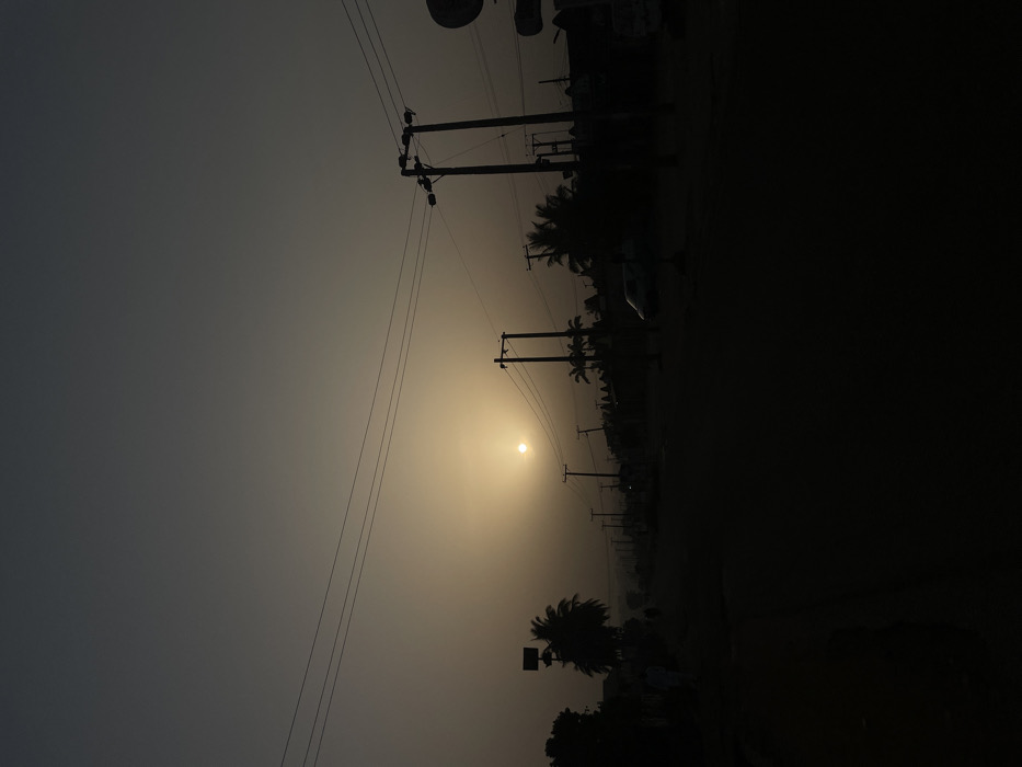 A hazy sunrise or sunset casts a pale light across a landscape dotted with utility poles and palm trees