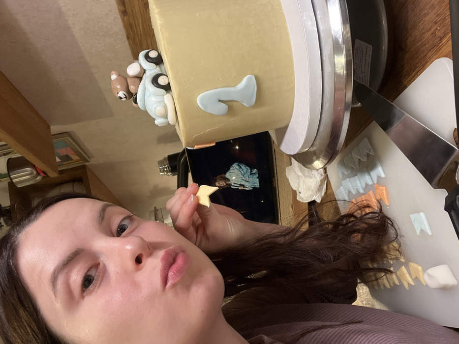 A woman holds a yellow star-shaped object, puckering her lips. A light brown cake with a blue number "1" is positioned behind her. A blue toy car and teddy bear decorate the cake's side. A television displaying a figure is visible between the woman and the cake. A white cutting board with rows of small, banner-shaped decorations in various colors lies to the right. A silver cake stand and a knife are also present on the board.