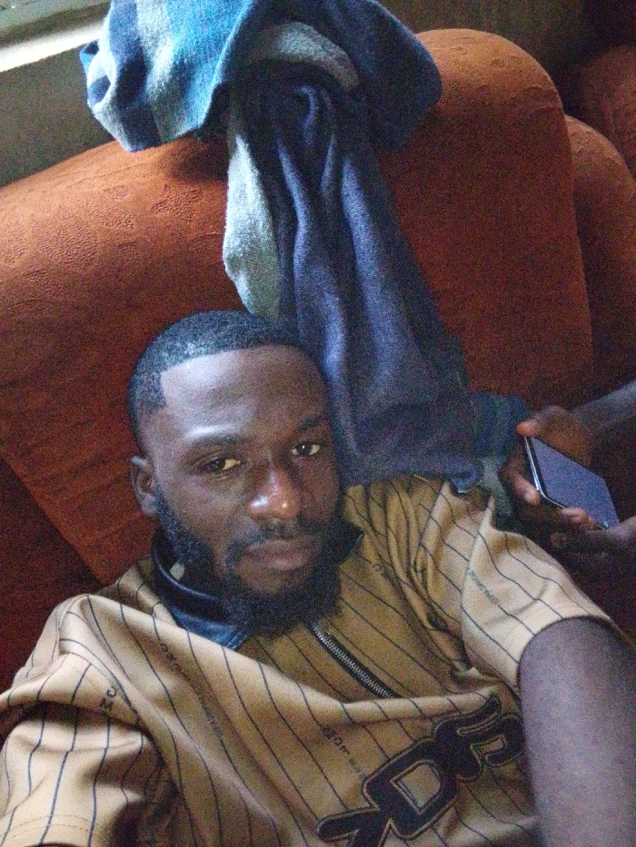 This image depicts an indoor scene, identified by the prompt as located in Agban, Nigeria. The central subject is an adult male with a dark complexion, a short, neatly trimmed haircut with a sharp hairline, and a full dark beard. He is wearing a short-sleeved, collared shirt featuring a tan or light brown base with thin vertical black stripes and a dark-colored collar. The shirt includes a partial zipper closure at the neck and a dark, possibly textual, appliqué or logo on the right chest area. The subject is positioned either seated or reclining on a reddish-brown/orange upholstered furniture item, which exhibits a textured pattern. He looks directly forward towards the camera with a neutral facial expression. To the upper left of the subject, draped over the back of the furniture, is a folded fabric item, possibly a towel, displaying blue, light blue, and grey stripes. On the right side of the frame, partially obscured by the subject's arm and the furniture, a hand belonging to another individual is visible, holding a dark-colored smartphone. The lighting in the scene appears to be consistent with an indoor setting, resulting in a somewhat subdued illumination.