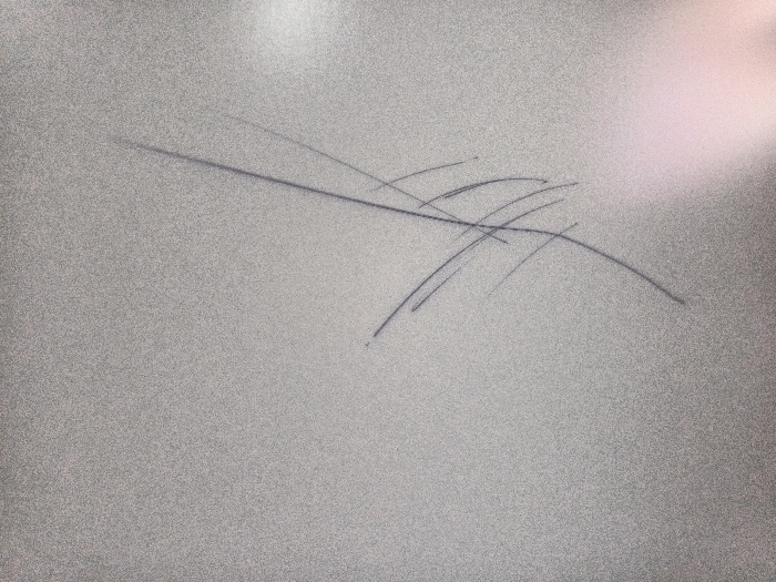 The image displays a light grey, granular, or textured surface, likely a wall or panel. Multiple dark, linear scratches are present, primarily across the central and upper-central areas. One distinct straight scratch extends diagonally from the upper-left towards the center-right. Intersecting this, several curved and arcing scratches are observed, concentrated in the upper-right-central region, varying in length and some appearing in parallel sets. A soft, reddish-pink light illuminates the upper-right corner of the surface. No individuals, other objects, or specific environmental details beyond the scratched surface and light source are visible. The precise location within Bandung City, Indonesia, is not identifiable from the visual evidence within the image.