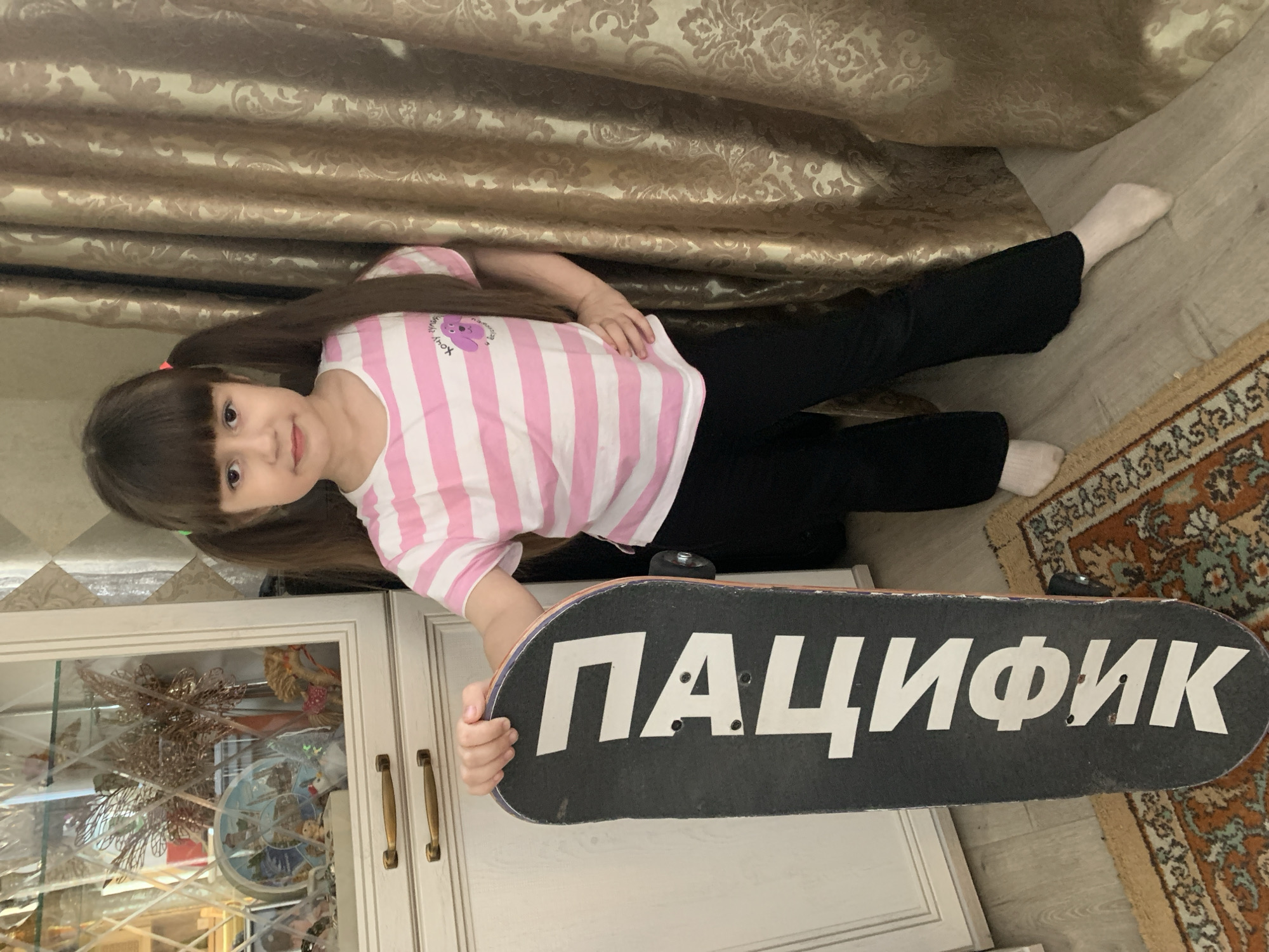 A young female child, approximately 5-8 years of age, stands within a residential interior in the city of Chaikovsky, Russia. She has dark hair styled in two pigtails with bangs and wears a pink and white horizontally striped t-shirt with a purple dog graphic on the front, black trousers, and light-colored socks. The child holds a black skateboard vertically with her left hand, displaying the white Cyrillic text "ПАЙФИК" on its grip tape. Her right hand rests on her hip. She maintains eye contact with the viewer. To her left, a light-colored wooden display cabinet with diamond-patterned glass doors contains various decorative items, including golden artificial foliage, a decorative plate with a winter scene, and small figurines. Two brass-colored pull handles are visible on the cabinet's lower section. To her right, ornate golden-brown curtains with a damask pattern cover a wall or window. The floor is composed of light-colored wooden planks, partially overlaid by a patterned rug featuring shades of orange, brown, and blue-green.