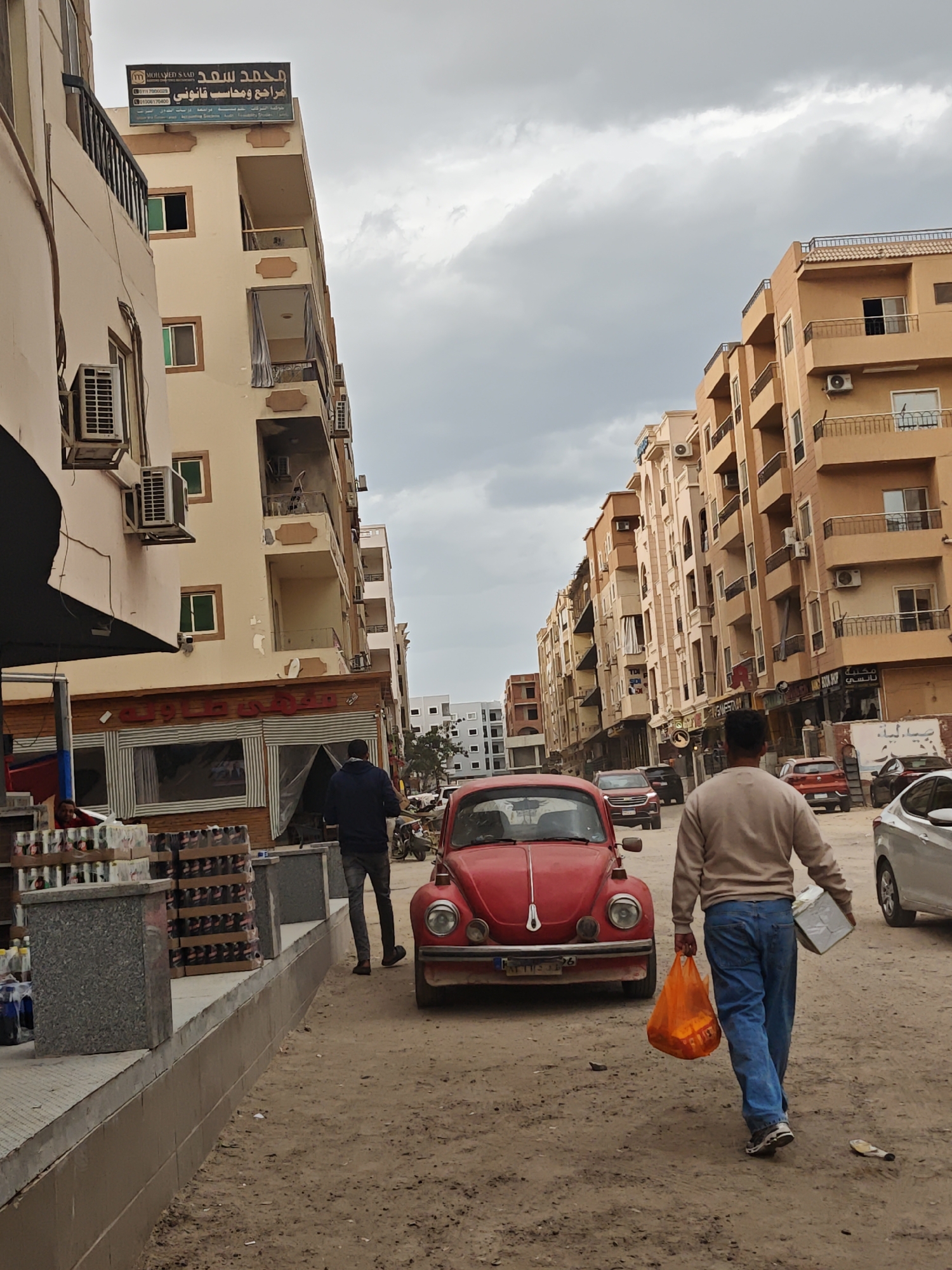 This image captures a street scene in Al Hadaba, Egypt, under an overcast sky. The unpaved dirt road dominates the foreground and mid-ground, flanked by multi-story residential and commercial buildings constructed primarily of light brown and tan materials. In the immediate foreground, a male individual walks away from the camera, wearing a light brown long-sleeved shirt, blue jeans, and sneakers. He carries an orange plastic bag in his left hand and a light-colored rectangular box in his right hand. Centered in the mid-ground, a vintage red Volkswagen Beetle with an Egyptian license plate is parked or stationary, facing away from the viewer. To the left of the Beetle, another male individual, wearing a dark blue hooded jacket and dark trousers, walks towards a commercial establishment on the left side of the street. This establishment, located on the ground floor of a five-story building, features a dark awning and display windows, with stacks of bottled beverages visible on a raised platform outside. A partially obscured figure in a red shirt is visible within the shop. The building above displays several external air conditioning units and a prominent rooftop sign in Arabic, featuring "MOHAMED SAAD" and "Legal Auditor and Accountant." The right side of the street is lined with similar multi-story buildings, also featuring balconies and numerous external air conditioning units. Various modern cars are parked or moving further down the street, including a dark red SUV, a silver sedan, and a white sedan, with a scooter or motorcycle also visible in the distance. The overall impression is an active urban environment with mixed-use buildings.