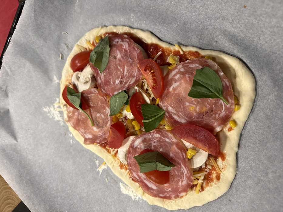 - "An uncooked, irregularly shaped pizza is positioned centrally on a sheet of white, wrinkled baking paper" by FM-kiOFW2, licensed under CC BY 4.0