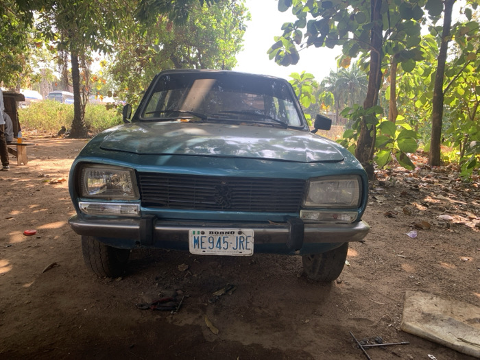 The image displays the front of a teal-colored Peugeot 504 sedan parked on reddish-brown dirt ground in Tataura, Nigeria, under bright daylight conditions