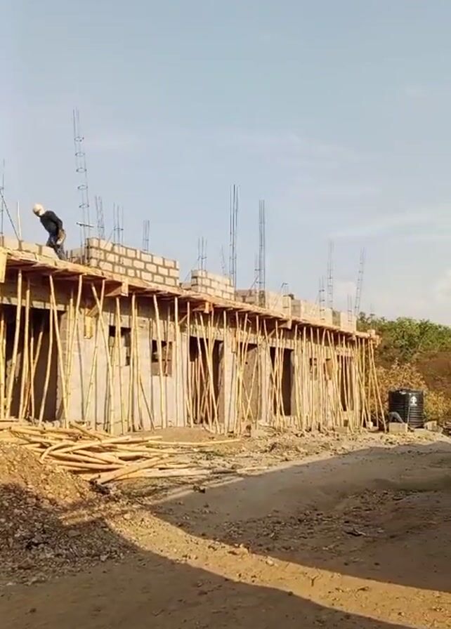 n outdoor construction site with a building under construction. The building is made of concrete blocks with window openings. Bamboo poles support the structure. Two construction workers are visible on the roof of the building, one is moving and working on the structure. Scraps of lumber are scattered around the base of the building. In the background, there is a cement mixer, a water tank, and vegetation. The ground is a dirt surface. The sky is clear with a few clouds.