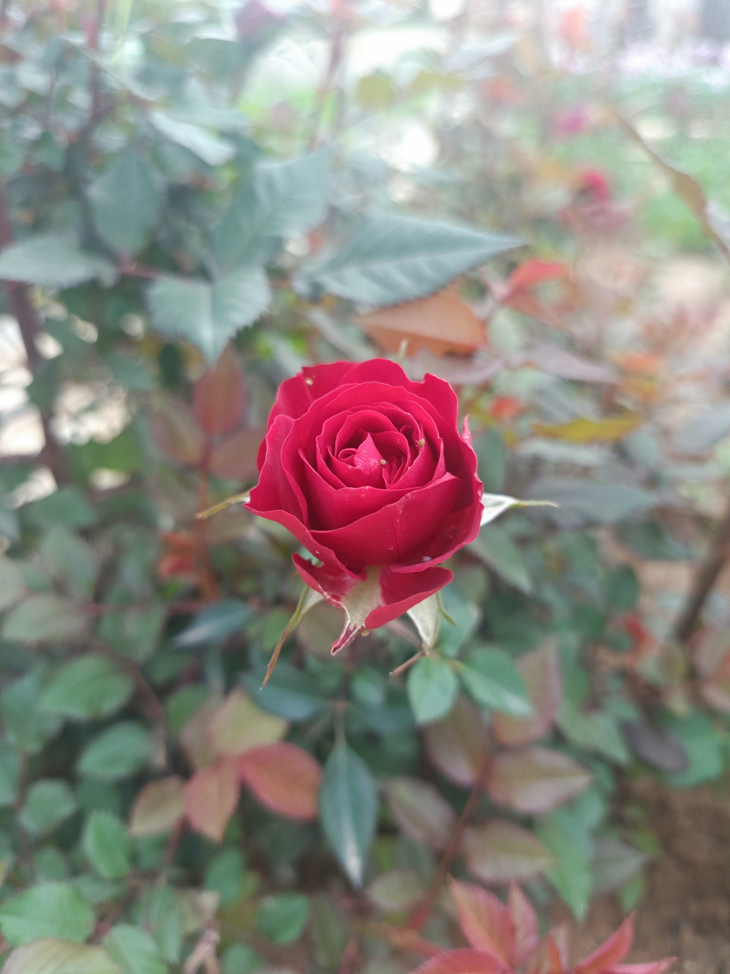 A vertically oriented, close-up photograph centers on a single, deep red rosebud in the early stages of opening. The petals are tightly coiled at the core and progressively unfurl outwards. Minute, light-colored specks are visible on some of the rose's inner petals. The bud is supported by a visible green stem, with green sepals partially encasing its base. The background is rendered in a shallow depth of field, heavily blurred, and comprises green foliage intermingled with scattered reddish-brown leaves, consistent with a garden or natural plant environment. No human subjects or animals (other than minute specks on the rose) are present. The scene is illuminated by diffused natural light. The location is in the city of Unknown, Unknown.