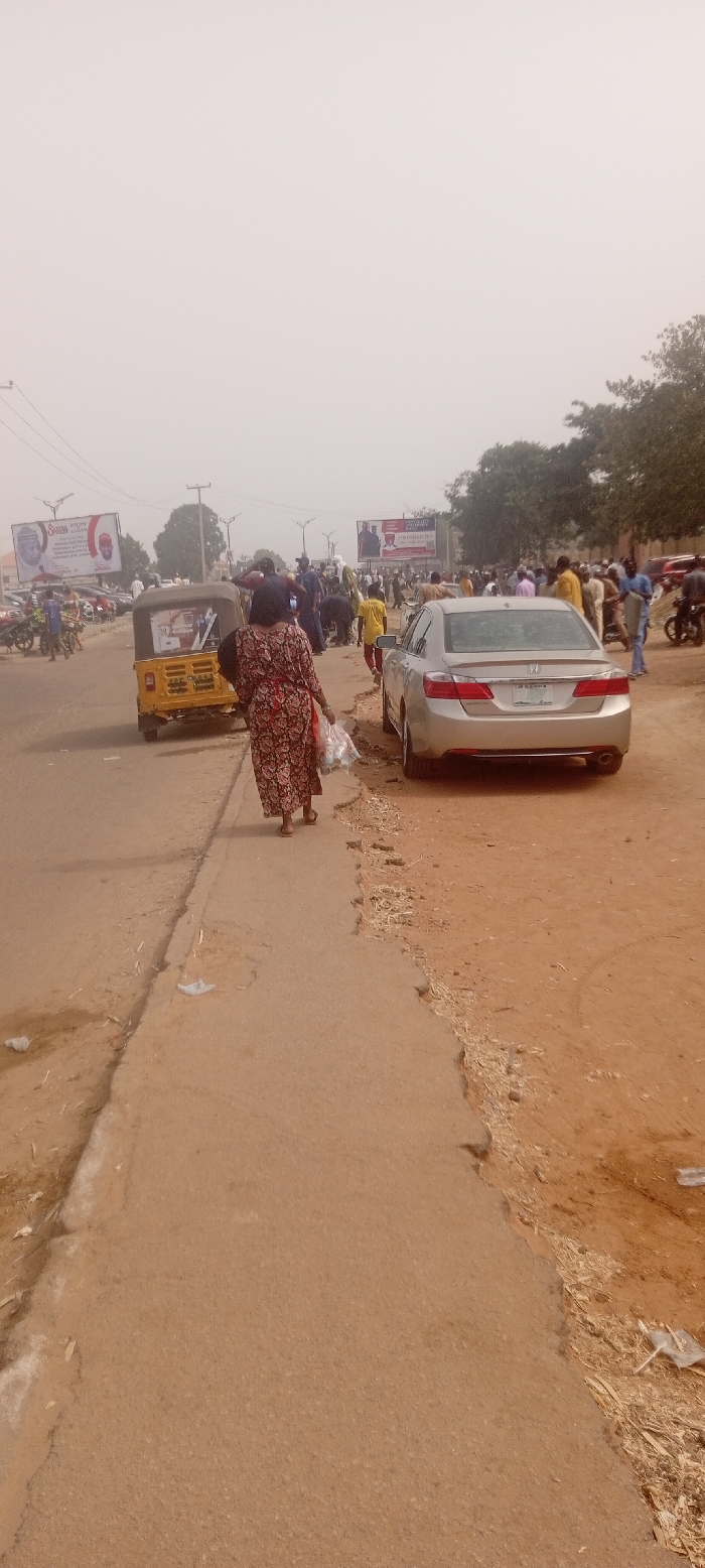 This image captures a street scene in Kofar Ruwa, Nigeria, under a hazy, light-gray sky