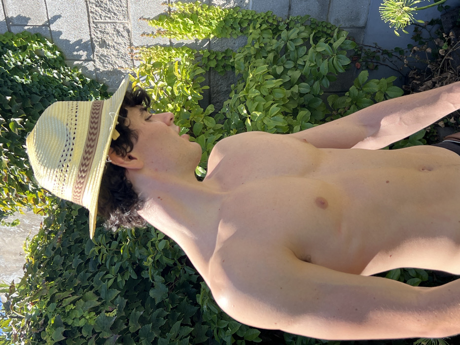 The image, taken in Quilmes Oeste, Argentina, captures a male subject from the chest up, positioned outdoors against a backdrop of green foliage. The individual, appearing to be a young adult with fair skin and dark, curly hair, is shirtless and wears a light-colored, possibly straw, fedora-style hat with a brown patterned band. He is viewed in profile, facing right, with his head slightly tilted down, suggesting a downward gaze. His left shoulder and arm are visible, along with his chest and abdomen. The background features a light grey concrete block wall mostly covered by dense, vibrant green climbing plants, likely ivy. Bright sunlight illuminates the scene, creating distinct shadows on the wall and highlighting the subject's skin. A partial view of a dark garment, possibly swimwear, is visible at the bottom edge of the frame. In the lower right background, an out-of-focus spherical green plant cluster with thin stems is present.