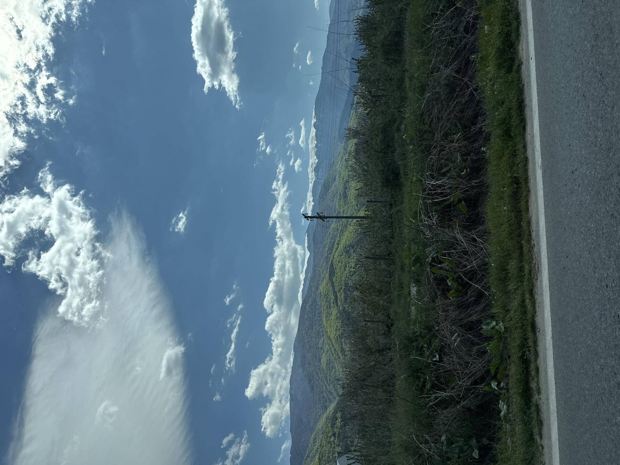 The image depicts a landscape near Parvomai, Bulgaria. A paved road occupies the right edge of the frame. To the left of the road is green vegetation and trees. In the background, there is a mountain range. A utility pole is visible within the foliage. The sky is blue with scattered white clouds.