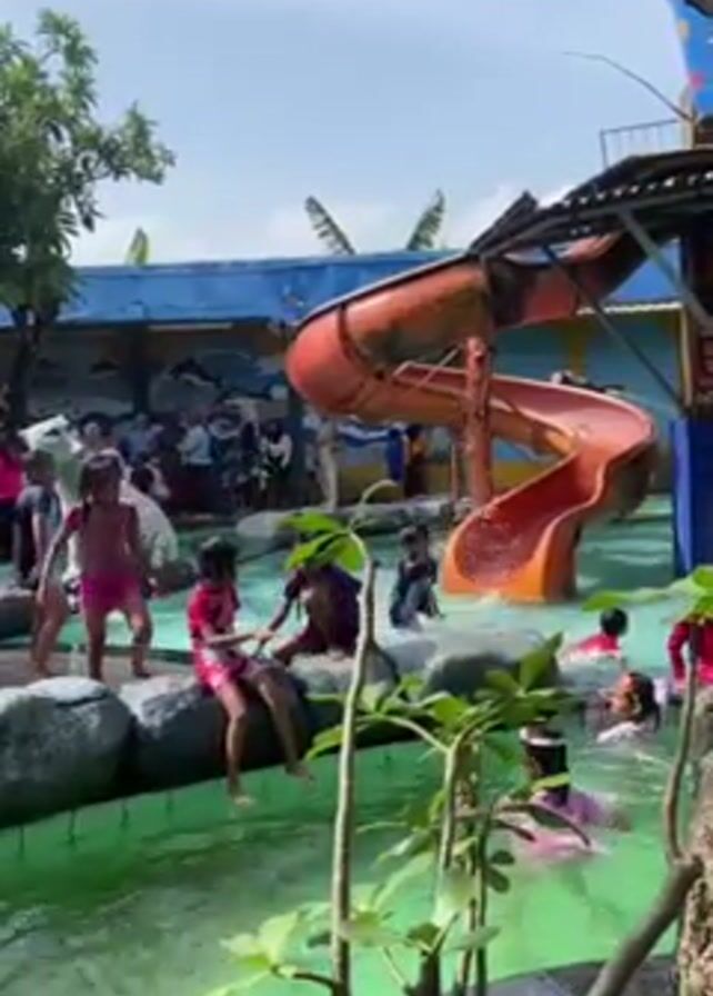The scene showcases a small water park with children enjoying various activities. An orange water slide stands prominently, children are seen sliding down into the pool. Some children are sitting on artificial rocks around the pool's edge while others swim in the green-tinted water. In the background, adults appear to be standing around observing the scene. The environment includes a building with a blue roof and a mural, as well as some trees and plants that frame the shot.