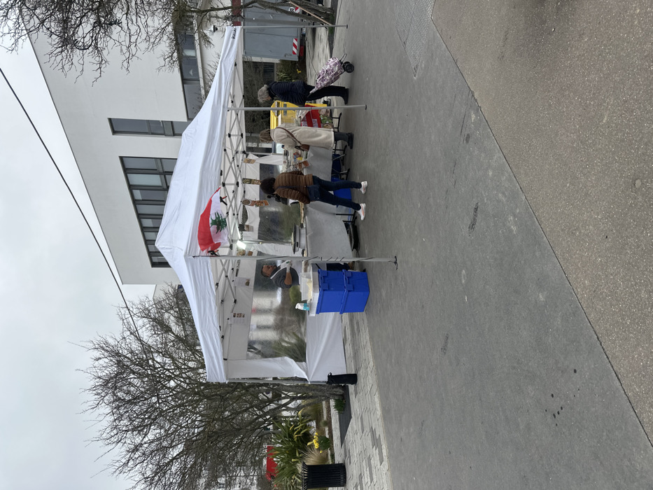 The image displays an outdoor market scene located in Serris, France, under an overcast sky. A white pop-up canopy tent, functioning as a market stall, is centrally positioned on a grey paved surface. A Lebanese flag, characterized by red stripes and a green cedar tree on a white field, is affixed to the front-right support of the canopy. Within the stall, a male vendor with dark hair and a beard, wearing a grey short-sleeved shirt, stands behind a light-colored table. Various food items, including what appear to be pastries or savory dishes, are displayed on the table. Two stacked blue plastic crates are situated at the front-left base of the stall. Three female customers are present at the stall, facing the vendor and the displayed items. From left to right, the first woman wears a brown quilted jacket and blue jeans. The second woman wears a long, light-colored (cream) coat. The third woman, identifiable as older with grey hair, wears a dark jacket and dark trousers, and holds a purple floral-patterned shopping trolley. The background on the left features a section of landscaping with bare deciduous trees, green shrubbery, and patches of yellow flowers (likely daffodils). A black cylindrical trash receptacle stands on the far left. Behind the stall, a modern white building with dark rectangular windows is visible. To the far right, a portion of a white utility vehicle and a yellow bin are partially obscured. Overhead utility lines are faintly visible against the sky. The ground is a uniform grey pavement.