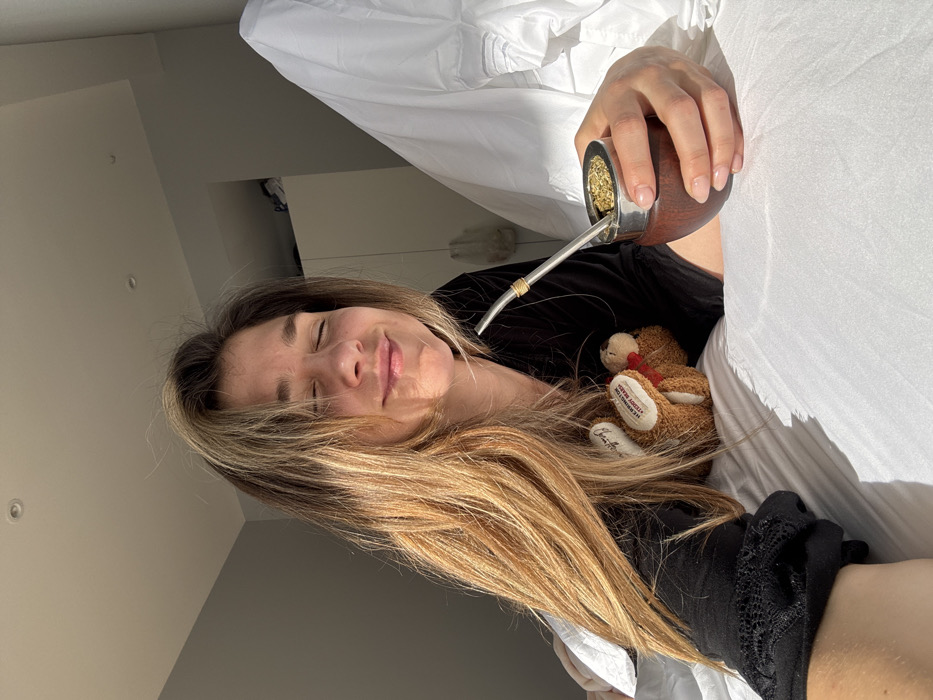 A woman lies in bed with a blissful expression. Her blonde hair is spread across the white sheets. She holds a wooden mate cup with a metal straw. A small teddy bear rests near her. She wears a black top and a black lace glove on one hand. The room is bright with sunlight.