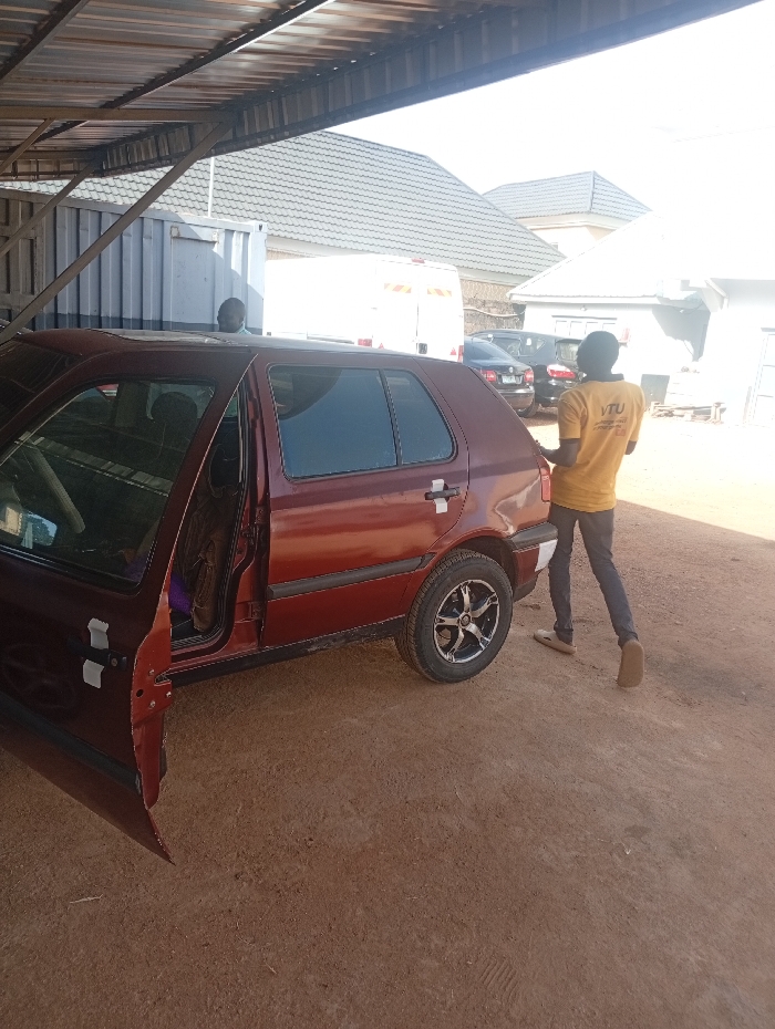 The scene depicts a vehicle service bay or outdoor garage in Unknown, Nigeria, under a corrugated metal roof structure. A maroon Volkswagen Golf Mk3 hatchback is prominently featured in the mid-ground, facing left. Its front driver's side door is wide open, exposing the interior. The car is fitted with black and chrome aftermarket alloy wheels, and white adhesive strips are applied to the body near the doors. Its rear bumper appears to be unpainted or mismatched. To the right of the vehicle, an adult male, viewed from behind, is walking to the left. He wears a yellow t-shirt with "VTU" printed on the back, dark trousers, and light-colored slip-on shoes. In the upper-left, a second male subject's head and shoulders are partially visible behind the car and a grey metal shipping container, looking towards the right. The ground is reddish-brown packed earth. In the background, under bright daylight, a white panel van with reflective markings, several dark sedans, and multiple buildings with grey pitched roofs are visible.
