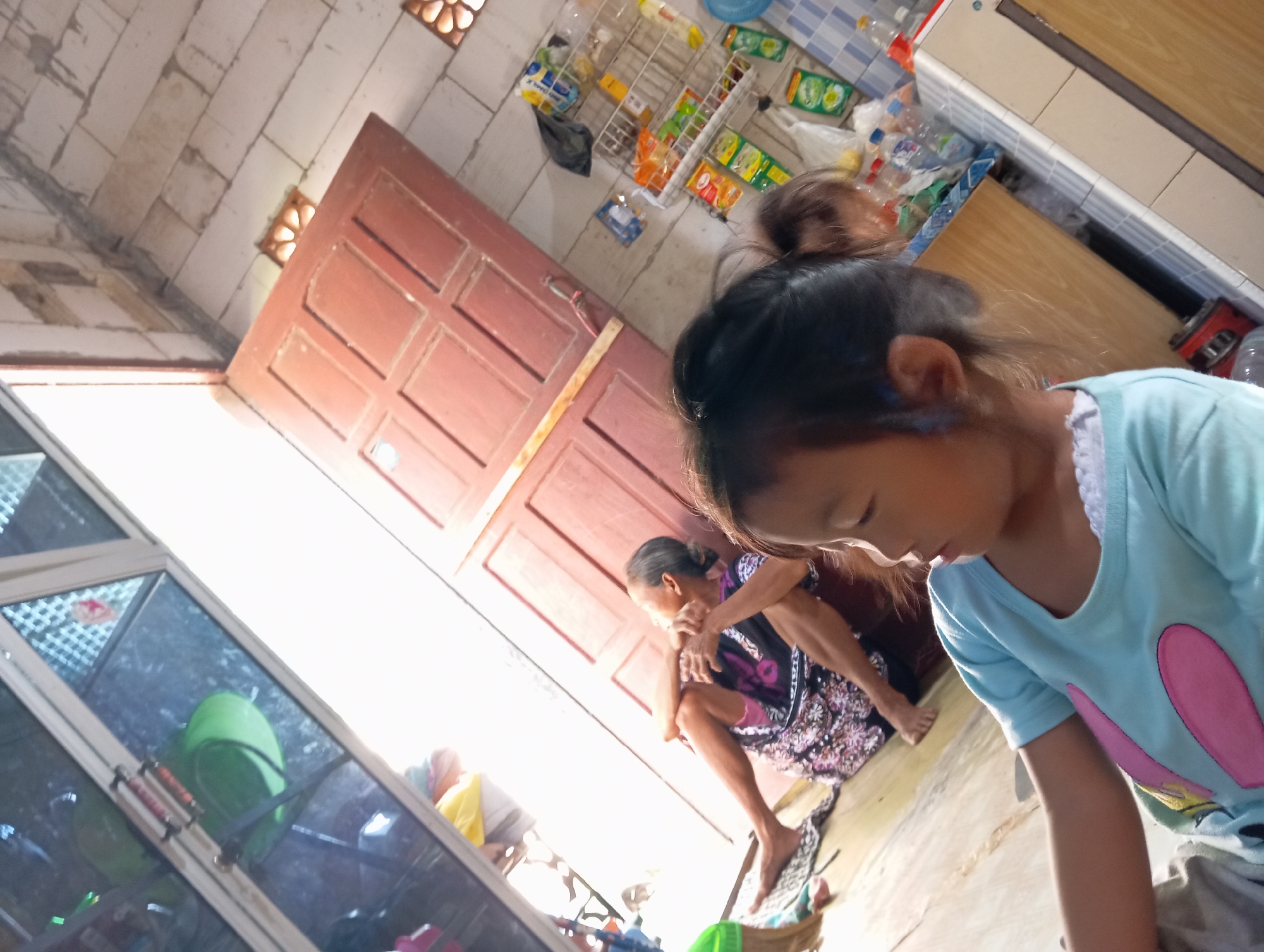 The photograph shows a young girl with her hair in a bun, wearing a blue shirt with pink details. She is positioned in the foreground, looking down. Behind her, an older woman sits cross-legged on the floor, wearing a dark, patterned dress. A red wooden door is visible behind the woman, and there's a window to the left of the frame. Above the door, there is a cluttered area with various bottles and packages. The location appears to be indoors, and based on the prompt, it is likely in Baron, Indonesia.