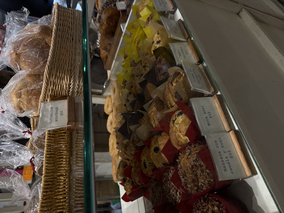 The image depicts an indoor bakery display case, likely situated within San Pedro Garza García, Mexico