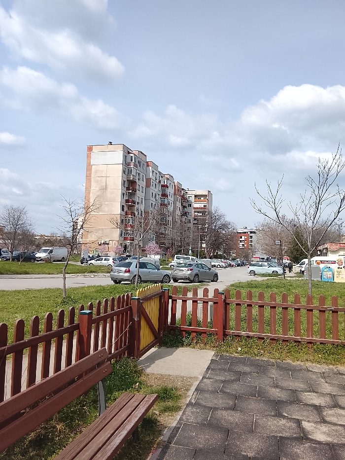 The image depicts an outdoor urban scene in a residential area of Plovdiv, Bulgaria, consistent with districts featuring large panel block architecture, such as Kyuchuk Paris. The scene is observed on a partly cloudy day. In the immediate foreground, a brown wooden park bench is partially visible on the lower left. Directly ahead, a red-brown wooden picket fence with a yellow gate section separates a grassy park area from a dark grey paved pedestrian path on the right. The midground features a multi-lane asphalt road with multiple vehicles. Several cars are parked along the road and in a visible parking lot on the left and further down the street to the right. Notable vehicles include a silver Audi A3 hatchback and a silver Mazda 3 hatchback. A narrow grassy median strip with several bare deciduous trees, some exhibiting early pink blossoms, runs parallel to the road. The background is dominated by a prominent multi-story (approximately 8-10 floors) residential building, characterized by a faded light beige/orange and white facade with numerous balconies. This building spans across the central and right portions of the background. Further to the right and in the distance, additional residential structures and a small cluster of kiosks or commercial units are visible. Several indistinct human figures are discernible in the distance near these kiosks. The sky overhead is light blue with scattered white cumulus clouds.
