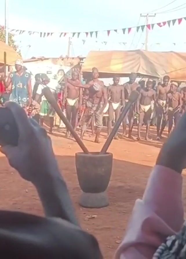 group of men in a field performing a traditional dance, possibly a ceremonial or cultural event. The men are mostly shirtless and wearing what appears to be loincloths or similar coverings. They stand in a line, some holding wooden sticks or implements, possibly pestles. In the foreground, two individuals are recording the event with their smartphones. The scene is set in a village or rural area with onlookers, including women in colorful dresses, and tents or shelters in the background. Pennants hang above the crowd, adding to the festive atmosphere. The overall environment suggests an outdoor cultural celebration or festival.