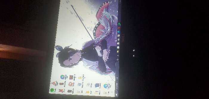 The image displays a Dell computer monitor illuminated in a dimly lit indoor setting in the city of Unknown, Unknown. The monitor screen shows a Windows operating system desktop. The background wallpaper features an anime character, Shinobu Kocho from Demon Slayer, depicted from the waist up, facing left. The character has dark hair styled in a butterfly-like bun, wears a black top, and a white and purple patterned haori with butterfly wing motifs on the sleeves. The desktop's left side contains multiple application icons, including Spotify, Netflix, Google Chrome, Microsoft Edge, and Steam. The Windows taskbar is visible at the bottom of the screen, displaying the Start button, a search bar, and several pinned application shortcuts. No individuals are present in the scene.