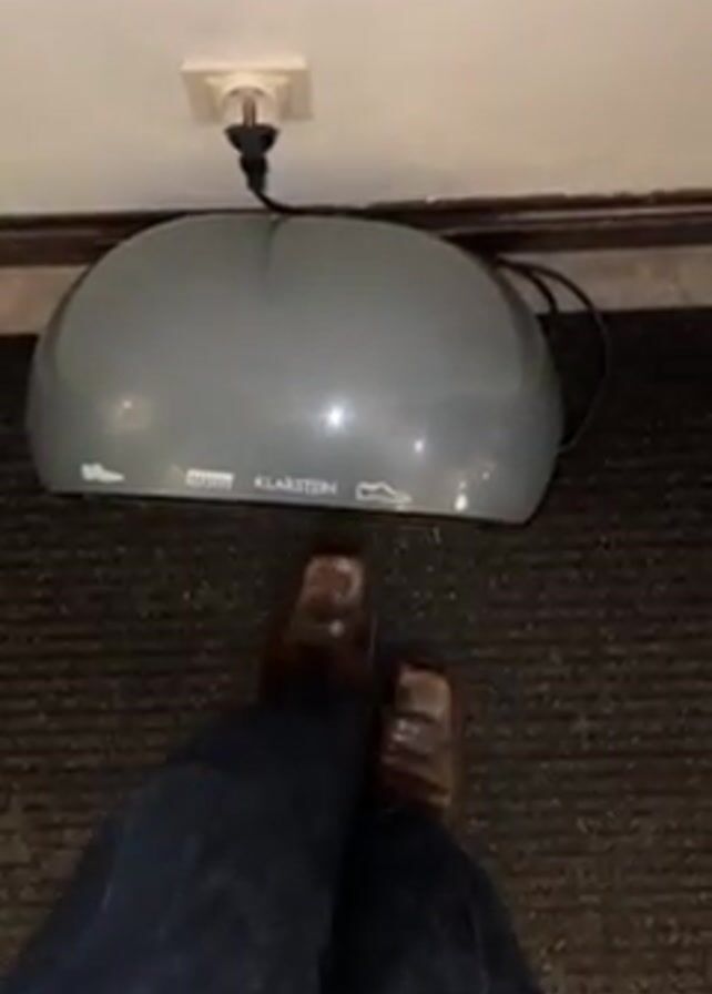 person standing in front of a gray Klarstein shoe dryer. The person is wearing brown dress shoes and blue jeans. The shoe dryer is plugged into a white electrical outlet in the wall. The shoe dryer is a gray, dome-shaped object with the word "KLARSTEIN" printed on the side along with the image of shoes. The person pushes down on the dryer with their foot. A motor whirs to life and it begins to function. The floor has gray carpet.
