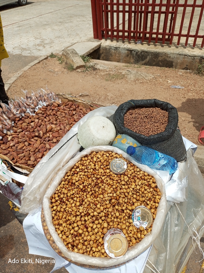 The image depicts a street food vendor selling various types of snacks in Ado Ekiti, Nigeria. The vendor's stand is situated near a red metal fence, likely on a street corner or public thoroughfare. The stand displays three different snacks: dates, a brown bean-like product, and roasted nuts. The dates are packed in plastic bags and arranged in a box, while the brown beans are in a black plastic bag. The roasted nuts are in a white plastic bag, with three small round tin cans placed on top. There is also a clear plastic bottle containing blue liquid, presumably water, beside the bag of nuts. The ground surface is dirt, indicative of an open-air setting. The image captures the scene from a slightly elevated viewpoint, showcasing the vendor's stand with a clear perspective. The overall ambiance suggests a bustling street scene in Ado Ekiti, Nigeria.