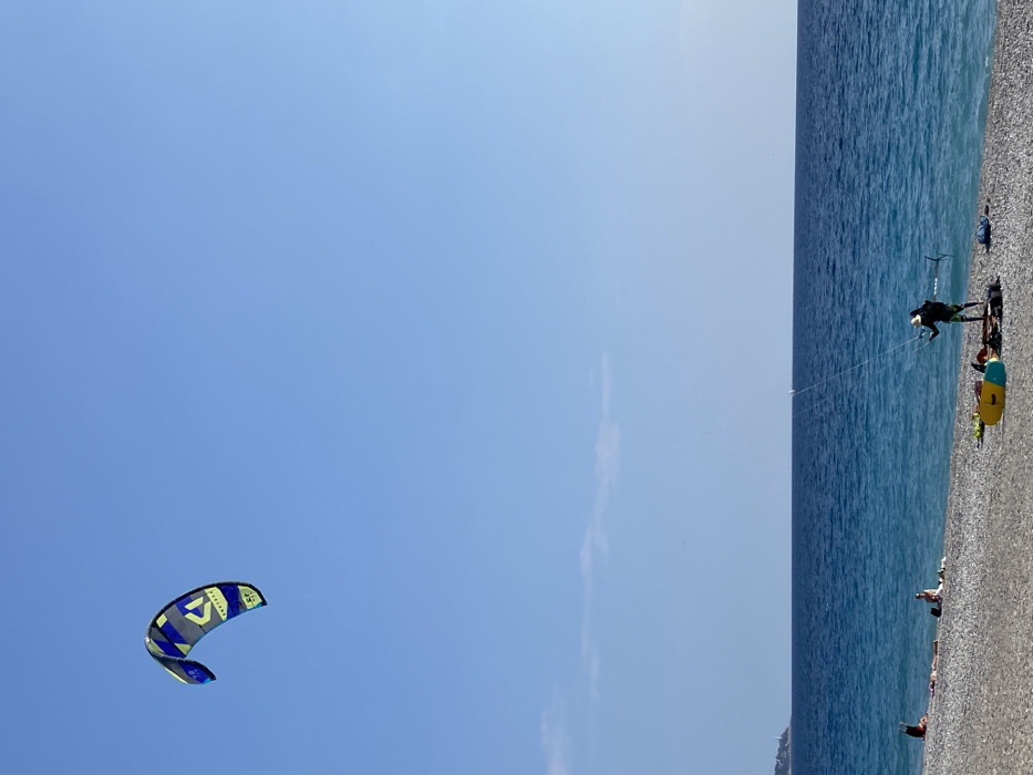 A bright, sunlit coastal scene in Nice, France, depicts a pebble beach, the Mediterranean Sea, and a clear blue sky. In the upper left, a prominent blue, yellow, and black Duotone brand kiteboarding kite is airborne, controlled by lines descending towards a lone individual in the lower right. This person, dressed in a dark wetsuit and hood, stands at the water's edge on the pebble beach, actively manipulating the kite's control bar. A metallic hydrofoil board is positioned next to them, partially in the water, alongside a yellow and turquoise board and other dark equipment bags on the gravel. To the left, three individuals are scattered on the pebble beach, relaxing; two are seated or reclining, and one lies prostrate. The deep blue sea spans the mid-ground, transitioning to a lighter turquoise near the shore. On the distant left horizon, a light-colored structure, indicative of a lighthouse or beacon, is visible on a landmass, consistent with Cap de Nice. The sky is clear blue with minimal cloud cover.