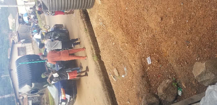 An outdoor scene in Ado-Ekiti, Nigeria, shows an unpaved reddish-brown dirt road bordered by an open drainage ditch