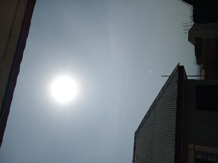 A daytime scene in Rafin Par, Nigeria, captured from a slightly elevated or shaded vantage point. The sky occupies the majority of the frame, appearing pale blue-gray and hazy, dominated by a brilliant, circular white sun positioned in the upper center. A dark, reddish-brown horizontal structure or overhang is visible across the top edge. In the lower-left quadrant, the corrugated metal roof of a building is prominently featured, sloping downwards from left to right. The building's walls are dark and obscured by shadow, with a visible window frame on the far left. Towards the lower-right, obscured structures consistent with partial walls or fences, some topped with vertical rebar, are visible. The overall environment suggests an outdoor setting under bright, hazy sunlight. No people are visible.