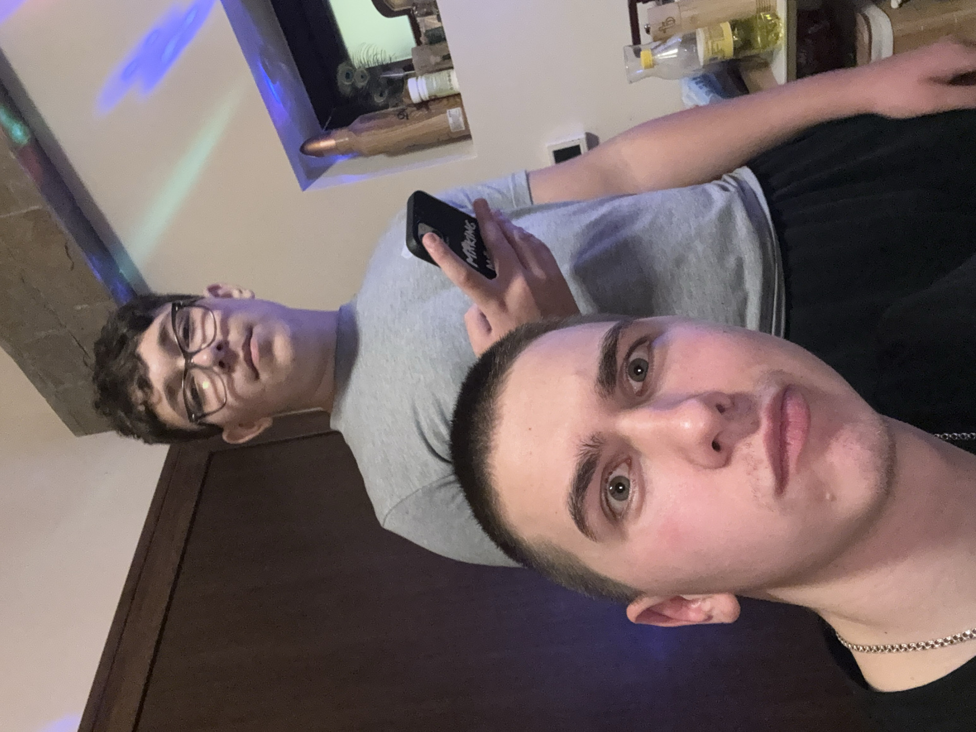 An indoor scene in Berkovitsa, Bulgaria, depicts two males. In the immediate foreground, a young male with a buzz cut and a silver chain necklace stares wide-eyed at the camera. He has light stubble above his lip and on his chin. Partially visible behind him and to the right stands a second young male wearing a grey t-shirt and dark-rimmed glasses, holding a black smartphone with a "MAKING" text visible on its case in his right hand. He looks directly at the camera with a neutral expression. The background features a dark brown wooden door or panel on the left, and a light-colored wall with projected colored light patterns (blue, green, red) towards the top. On the right, a recessed shelf contains a tall, bronze-colored bullet-shaped bottle, several peacock feathers, and small white containers. Below the shelf, a clear carafe with a yellow cap and a bottle containing yellow liquid are visible on a surface.