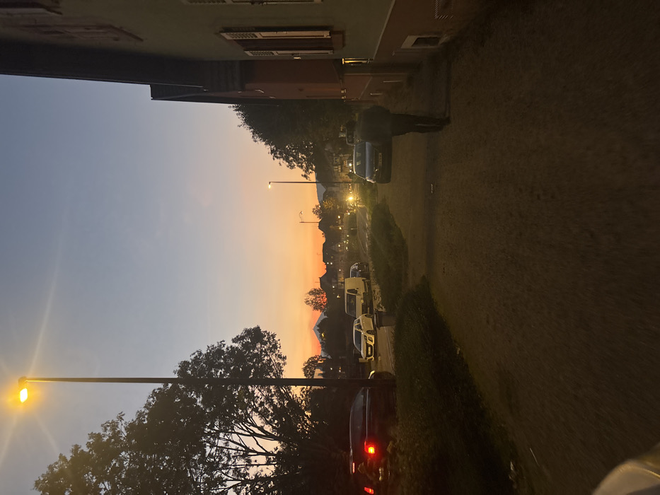 The image depicts an urban street scene in Sélestat, France, during twilight. The sky transitions from light blue at the zenith to an intense orange and yellow hue at the horizon, where distant mountains are faintly visible. In the left midground, a tall, dark street light with a brightly illuminated yellow-orange luminaire stands partially obscured by a large, dark green deciduous tree that occupies the left foreground and midground. Below the tree, a dark sedan or hatchback displays illuminated red taillights. A dirt or gravel pathway extends from the foreground into the midground. An individual, seen from behind, walks right-to-left on this pathway, wearing a dark jacket and trousers. To the right of the pathway, the side of a multi-story building with a light green facade and multiple windows featuring closed reddish-brown shutters dominates the right side of the frame. Further down, another building with a reddish-orange facade is visible. Parallel to the pathway on the left, a paved road stretches into the midground. Several vehicles are present on this road, including a white hatchback, a white commercial van, and other vehicles with illuminated headlights visible further down the street. Another street light with a yellow luminaire is visible in the distant midground along the road. A light-colored municipal waste bin is positioned between the pathway and the road. Lush green vegetation, including shrubs and trees, is present along the roadside and in the background.