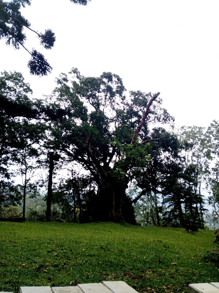 A large tree with a wide canopy dominates the image, its dark trunk rooted in a grassy area. Surrounding it are other trees, some slender and others more dense, creating a sense of depth. The sky is overcast, casting a soft, diffused light on the scene. A few branches from a separate tree are visible in the upper left. In the foreground, there is a paved stone ground.