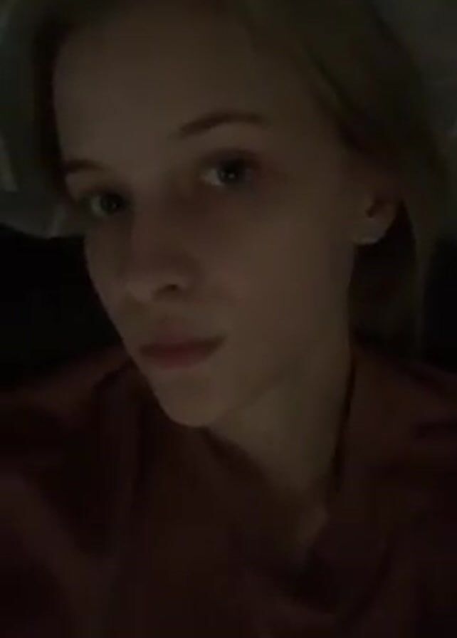 The video features a close-up shot of a fair-skinned person with light blonde hair, wearing a reddish-brown top. The person is initially lying down with their eyes closed, then opens them, revealing a clear, light eye color. The lighting is dim, casting shadows on the face. The background is out of focus, suggesting an indoor environment.