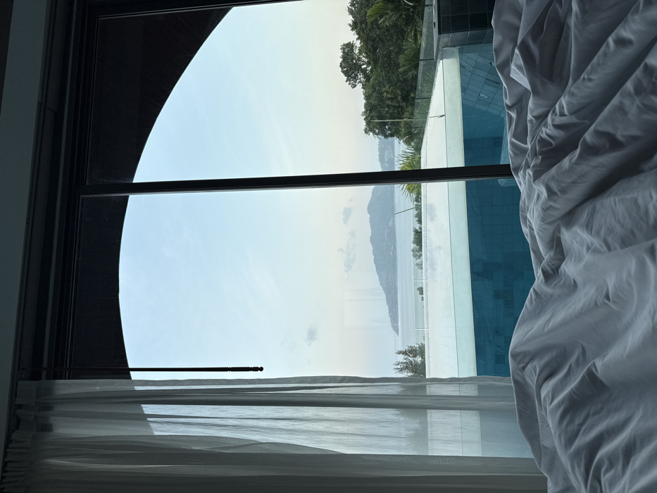 The image depicts an interior view looking outwards through a large, dark-framed window in a room located in Patong, Thailand. In the foreground, rumpled white bedsheets occupy the lower portion of the frame, indicating a bed. To the left, a sheer white curtain is partially drawn, and a black curtain pull rod hangs vertically. Through the window, an infinity-edge swimming pool is immediately visible in the midground, featuring clear blue-tiled water. Beyond the pool, a clear glass barrier or railing separates it from tropical green foliage and trees. The distant background reveals a calm body of water, consistent with the Andaman Sea, stretching towards the horizon under a light blue sky with minimal cloud cover. Multiple forested islands or coastal hills rise from the water in the distance. No individuals are present in the scene. The lighting suggests either early morning or late afternoon.