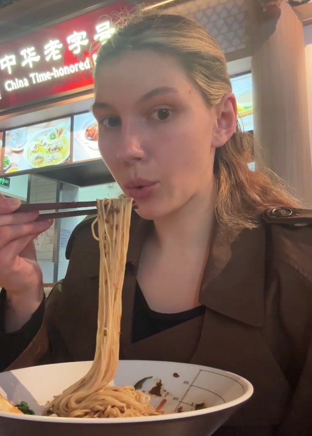 A woman with fair skin and blond hair pulled back is eating a large portion of noodles with chopsticks from a white bowl. She is wearing a brown jacket over a black top. Behind her, a sign reads "China Time-honored Brand" in both English and Chinese. There are also food menu pictures visible behind the sign. The woman is looking directly at the camera as she eats. She appears to be indoors in a food court or restaurant setting.
