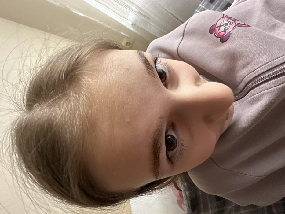 The scene is located in Burgas, Bulgaria. A high-angle, close-up photograph captures the upper body and head of a young individual, appearing female. The subject has light brown hair parted centrally, with fine strands visible. Her skin exhibits minor textural irregularities on the forehead. She possesses dark brown eyes, looking directly upwards towards the camera. The individual is wearing a light purple zip-up hoodie. A prominent graphic on the right sleeve features a stylized pink cartoon bear head with crossed-out eyes and a stitched mouth. The background indicates an indoor setting, with a white electrical outlet visible on a light-colored wall to the right, adjacent to white translucent curtains. A grey fabric with a plaid pattern is partially visible on the lower left, possibly a blanket or part of an upholstered item. The overall composition suggests a self-portrait or a very close-range photograph taken from above.