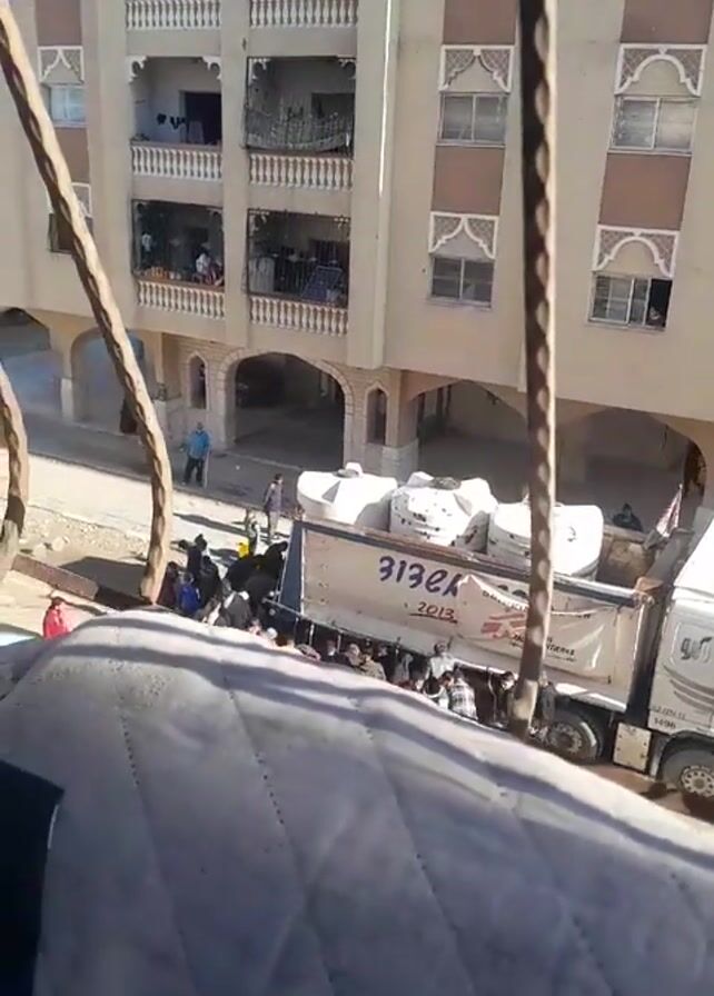 From a high vantage point behind a metal railing, the video shows a street scene in front of an apartment building. A large truck with white tanks or containers in the bed is parked on the street, and a group of people are gathered around it. Some of them appear to be receiving or handling items from the truck. The apartment building is beige with multiple stories, balconies, and arched walkways on the ground level. People can be seen on some of the balconies. The sky is blue and the scene appears to be well-lit. Overall, the video captures a moment of activity and possible distribution of supplies or goods in an urban setting.