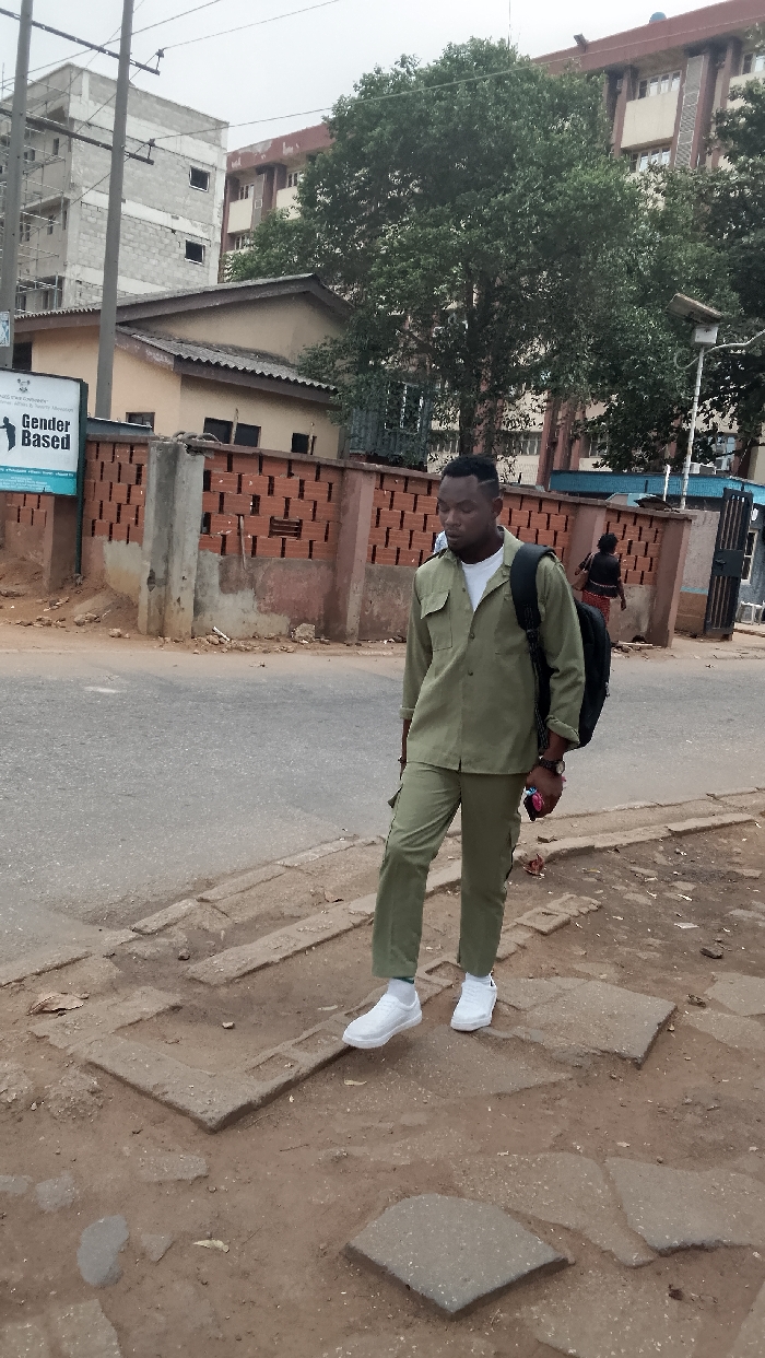 man in a green uniform and a black backpack walking on a paved street. He is wearing white sneakers. The street is lined with a brick wall on the left side and a concrete building on the right side. In the background, a large tree is visible. There is a sign on the brick wall that reads "Gender Based." The coordinates provided, 6.617 latitude, 3.359 longitude, place the location in Ikeja, Nigeria, a suburb of Lagos. The scene is set in an urban environment, suggesting a busy, populated area. The man's attire and the sign suggest a possible location related to public service or a government office.