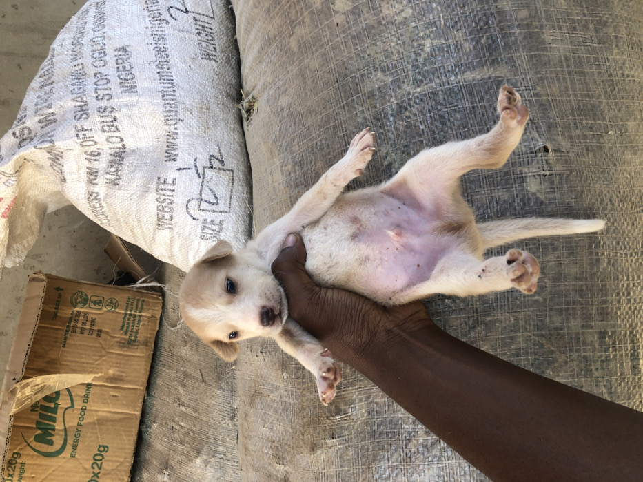 - "A light-colored puppy is held vertically by a human hand against a textured, grayish background in Bauchi, Nigeria" by FM-iGFmW2, licensed under CC BY 4.0
