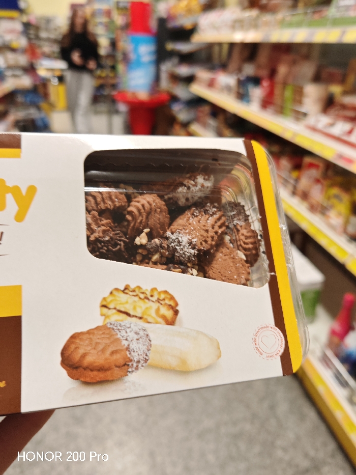 The image depicts the interior of a retail establishment, identified as a supermarket located in Haskovo, Bulgaria. In the foreground, a hand holds a white cardboard box containing an assortment of chocolate cookies or small pastries, visible through a clear plastic window. The cookies are dark brown, some topped with white powdered sugar and others with chocolate sprinkles or chopped nuts. The box features printed graphics showing three different cookie types and a small circular emblem with "with lovemade with love" text. The bottom left corner of the image displays "HONOR 200 Pro." The background is out of focus, revealing typical supermarket aisles. Yellow-edged shelving units are stocked with various blurred packaged consumer products, extending into the distance on both the left and right sides. A single individual is visible in the left background, standing in an aisle; they are wearing a dark top and light-colored pants. A red display stand with a blue cylindrical object on top is present in the mid-left background. The floor appears to be a light grey color.