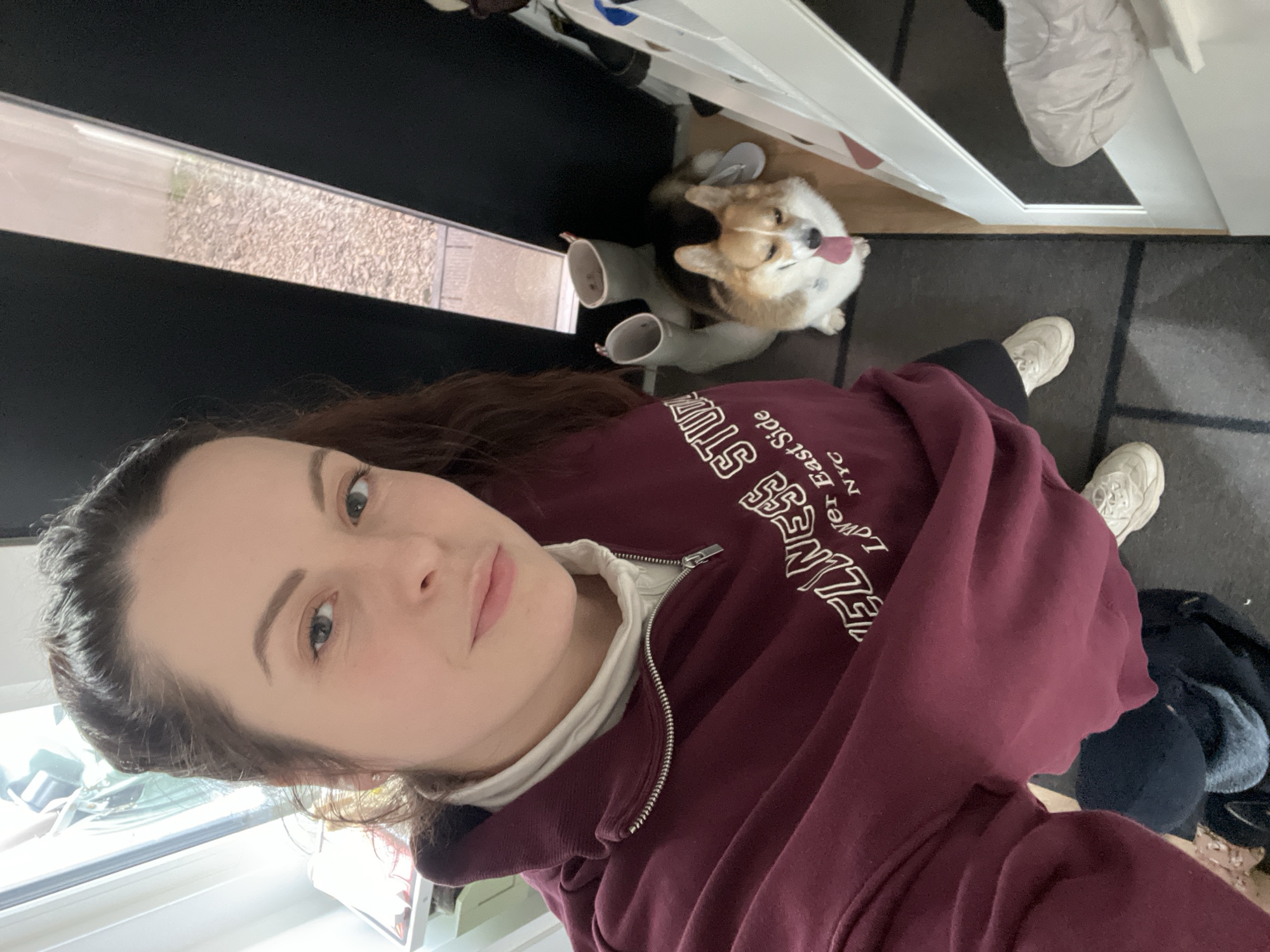 A woman takes a selfie indoors. She is wearing a burgundy zip-up sweatshirt with the words "WELLNESS Lower East Side NYC" on the front, and white sneakers. Her hair is brown and pulled back. Beside her are a pair of light green rain boots and a white and brown corgi dog with its tongue sticking out. The dog sits near a door with a window leading outside. The scene takes place on a dark-colored floor with a grid pattern. The location cannot be determined to be Gangloff, Germany, without additional information.