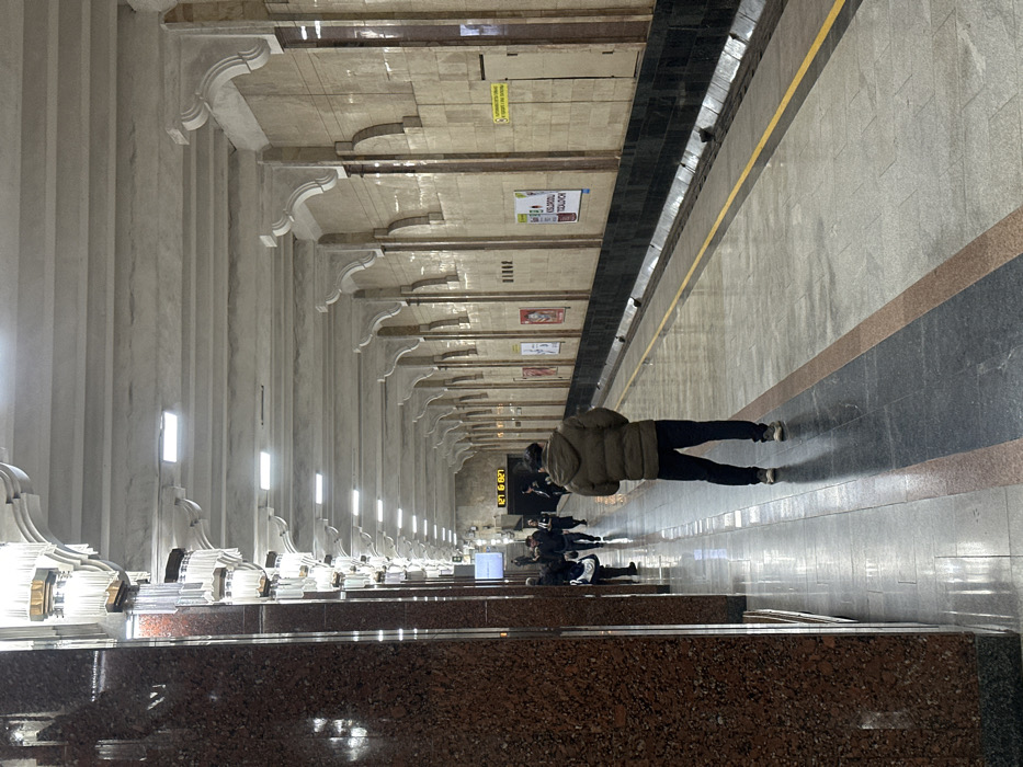 The image captures the underground platform of a Tashkent Metro station in Uzbekistan