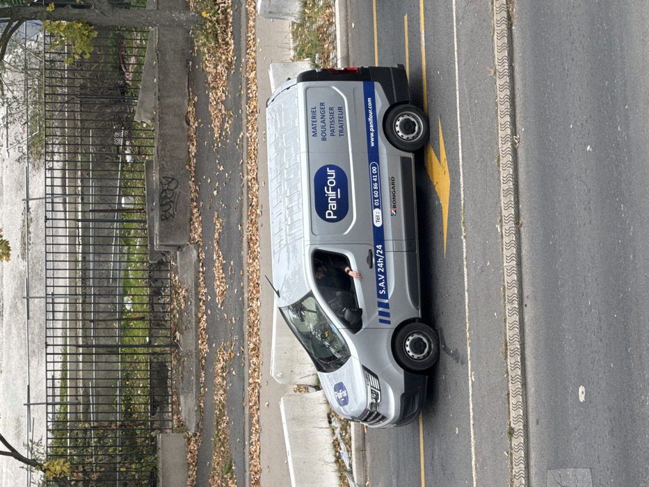The image displays a silver Panifour delivery van in motion on a paved road in Saint-Ouen-sur-Seine, France