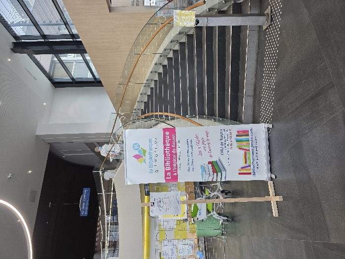 The image depicts a modern, multi-level interior space within the University Hospital Center (CHU) of Rouen, France. The scene features a prominent curved staircase with dark grey steps, transparent glass railings, and a wooden handrail, leading to an upper floor. In the foreground, a dark grey tiled floor, partially covered by white tactile paving, displays a freestanding banner advertising "La Bibliothèque à l'Hôpital de Rouen" (The Library at Rouen Hospital). The banner shows book illustrations, a website address (biblihuchurouen.jimdo.com), and contact information for CHU de Rouen. To the left of the banner, a wooden easel-like stand and a medical equipment cart with a green bin are visible. A wall in the far left background is covered with various papers and posters. To the right, at the base of the staircase, stands a metallic post with a yellow object attached, possibly a dispenser or sensor. On the upper landing of the staircase, a person in a white uniform and face mask stands near the railing, with a second person in white partially visible further back. Overhead, a large blue directional sign reads "P4 INPH. CENTRAL" and "RADIOLOGIE." The right side of the space features large windows with dark frames and light wooden wall paneling, while the ceiling is high and modern with integrated lighting.