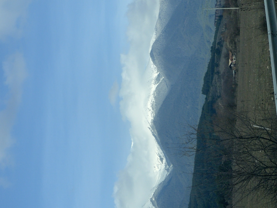 The image presents a panoramic landscape view near Dobrinishte, Bulgaria, under a light blue sky with scattered white and grey clouds. In the background, a prominent mountain range, likely the Pirin Mountains, exhibits snow-covered peaks with dense evergreen forests on its lower slopes. Clouds partially obscure the higher elevations of the mountains. The midground consists of a series of rolling hills covered with dry, brown vegetation and numerous bare deciduous trees, indicating a dormant season. A single-story building with a light-colored roof and walls is visible in the mid-right, nestled among sparse trees. To the far right, a portion of a taller, multi-story building with a darker roof is partially visible, indicating the proximity of a developed area. The immediate foreground features a section of a metallic grey guardrail and the dark, intricate branches of a leafless tree, suggesting the viewpoint is from a roadside. No human subjects or discernible activities are present.