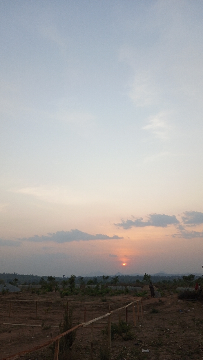 The image depicts an outdoor scene at sunset in Zango-ndaji, Nigeria. The sky occupies the upper two-thirds of the frame, transitioning from a light blue-grey at the top to hues of orange and pink near the horizon. The sun, a prominent orange-red semicircle, is positioned just above the distant horizon, slightly right of center. Scattered, dark grey cumulus clouds are visible across the lower portion of the sky. The foreground consists of reddish-brown, dry earth, indicative of undeveloped land or a construction site. A rudimentary wooden fence, constructed from horizontal poles and vertical stakes, extends from the lower-left corner towards the mid-right. Sparse green vegetation, consisting of small plants and shrubs, is present near the fence and scattered across the ground. In the midground, beyond the fence, additional patches of green foliage are visible. Linear structures, appearing to be concrete block walls or foundations, are under construction. A dark-clothed individual is standing upright on a dirt path in the mid-right, facing left. Another less distinct figure or group is partially visible further to the right. Scattered debris lies on the ground in this area. The background features a silhouette of distant hills or mountains against the twilight sky.