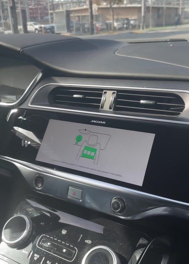 - ". The video shows the interior of a black Jaguar I-Pace. The dashboard has a touchscreen displaying a diagram related to seating. The steering wheel is leather-wrapped and features the Jaguar logo. Outside the window, city streets with buildings and cars can be seen. The sky is bright and sunny. The seat appears to be made of black leather. The interior is clean and well-maintained. A brief message on the touchscreen tells the driver to consult the card in the seat back for more information." by FM-mLRHH2, licensed under CC BY 4.0