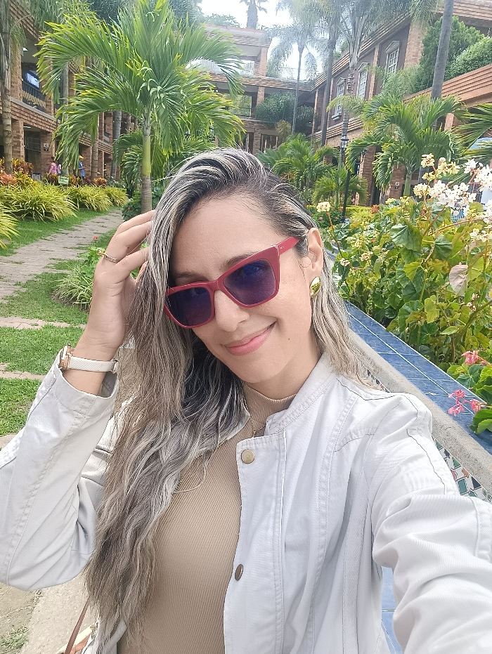 An outdoor daytime image captures a woman in a medium shot, centered and looking directly at the camera, in Carrizal, Venezuela. She has long, wavy, multi-toned hair, with her right hand raised to her right temple. She wears red, cat-eye sunglasses with dark lenses, a light beige ribbed top, and an open light-colored jacket secured with brass-toned snaps. Visible accessories include a gold-colored necklace, a white-strapped watch on her left wrist, a gold ring on her left ring finger, and a gold circular earring on her right ear. A faint smile is present. The background features multi-story buildings constructed of reddish-brown brick, exhibiting balconies and terraced greenery. Lush tropical vegetation, including numerous palm trees, dense foliage, and white and pink flowering plants, fills the scene. A paved walkway is visible to the left, and a decorative tiled wall with blue and geometric patterns is on the right. The illumination is consistent with natural daylight.